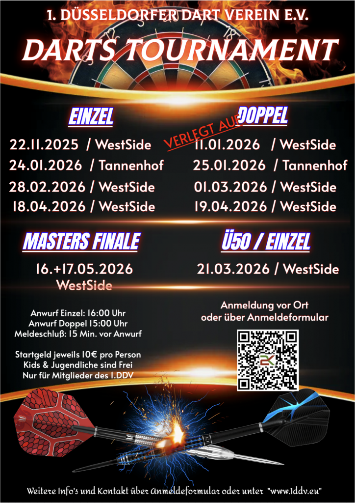 Neuigkeiten rund um den 1.Düsseldorfer Dart Verein e.V. !!! UPDATE !!! Die Bereiche Vereine, Download, Masters, Turniere und Vorstand wurden aktualisiert. Masters 2025/26