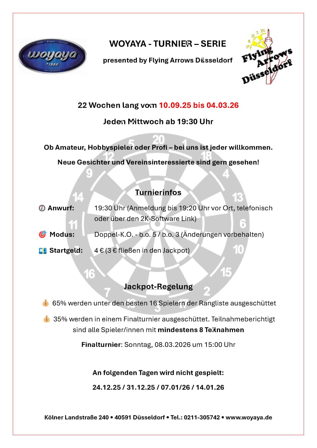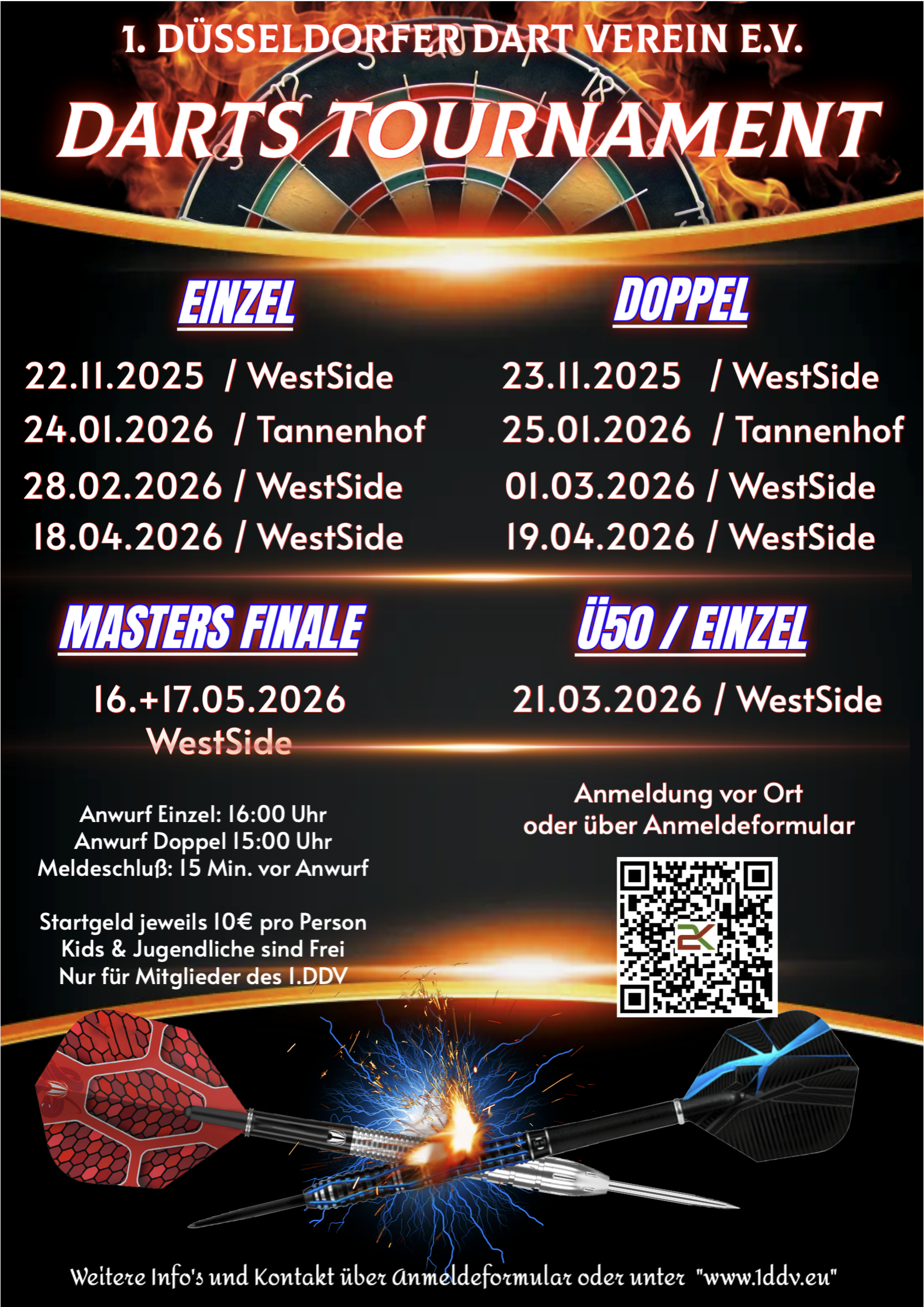 Der 1.Düsseldorfer Dart Verein bietet Teams die Möglichkeit, Turniere über unsere Seite und über unsere Social Media Kanäle bekannt zu machen. Darüber hinaus bieten wir auch die Möglichkeit Turniere zu veröffentlichen, sofern diese in Düsseldorf und Umgebung stattfinden, auch wenn diese nicht von Teams des 1.DDV ausgetragen werden. Sendet uns dazu einfach einen kurzen Text, eventuell mit einem Plakat im Bild oder auch PDF Format.